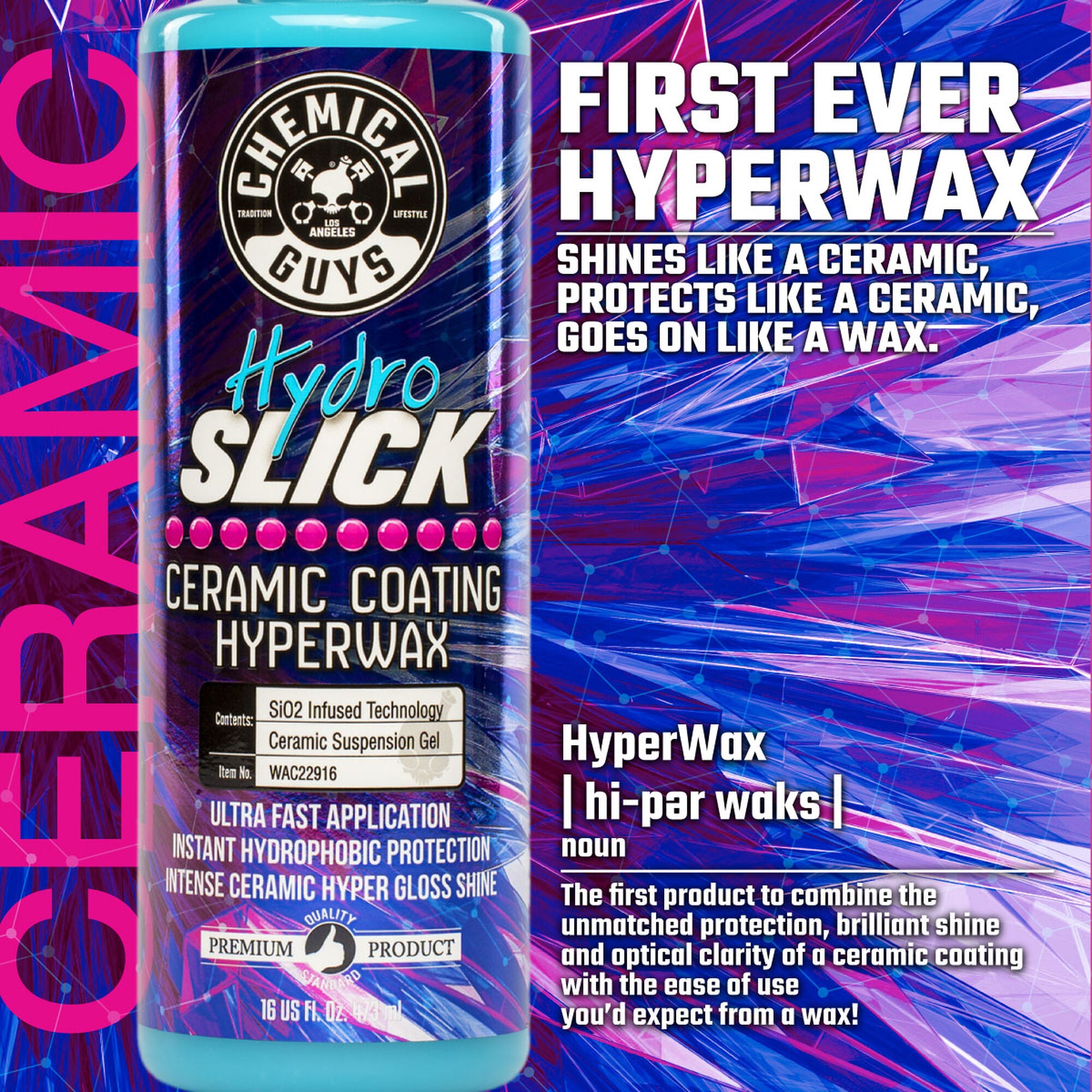 HydroSlick is a true ceramic coating that provides superior protection. brilliant shine. and optical clarity. This gel formula is applied with an applicator and buffed off like a wax. and lasts for up to a year.